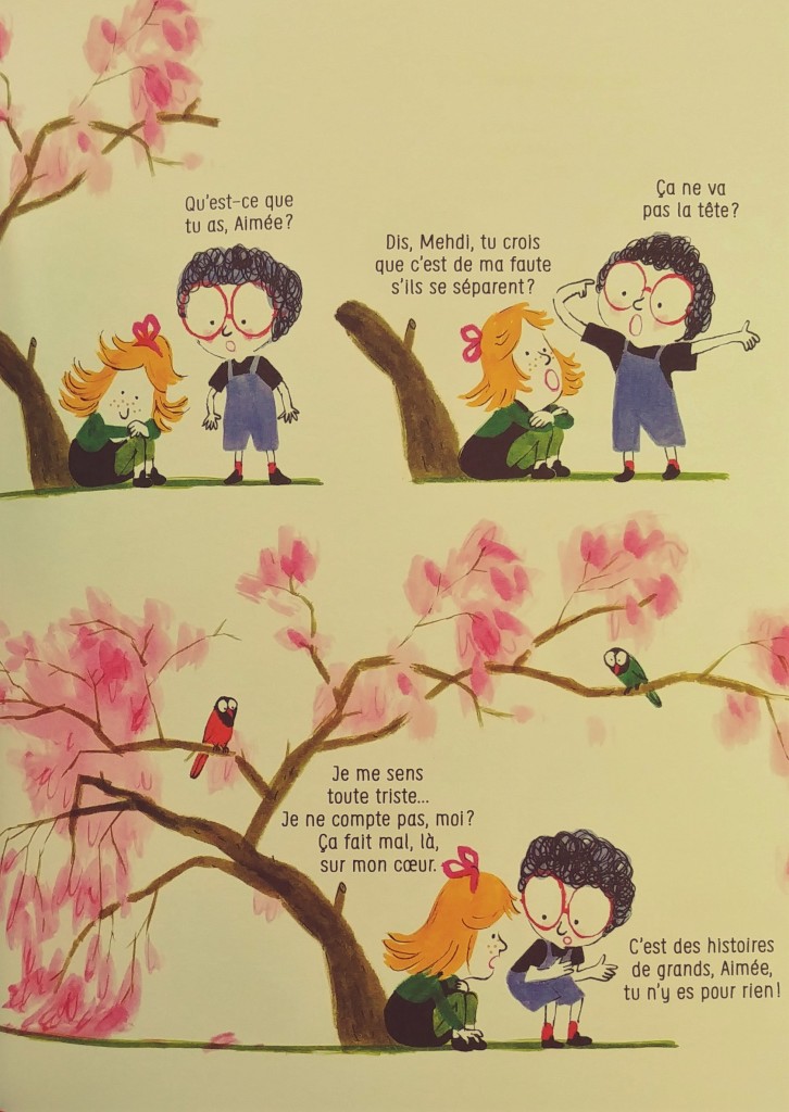 Je trouve qu'Aimée et Mehdi sont deux personnages attachants auxquels les enfants peuvent s'identifier facilement. L'une s'interroge sur ce qu'elle ressent et l'autre est d'une curiosité insatiable. Et l'un et l'autre sont liés par une forte amitié qui les invite à se soutenir dans la joie ou la peine.