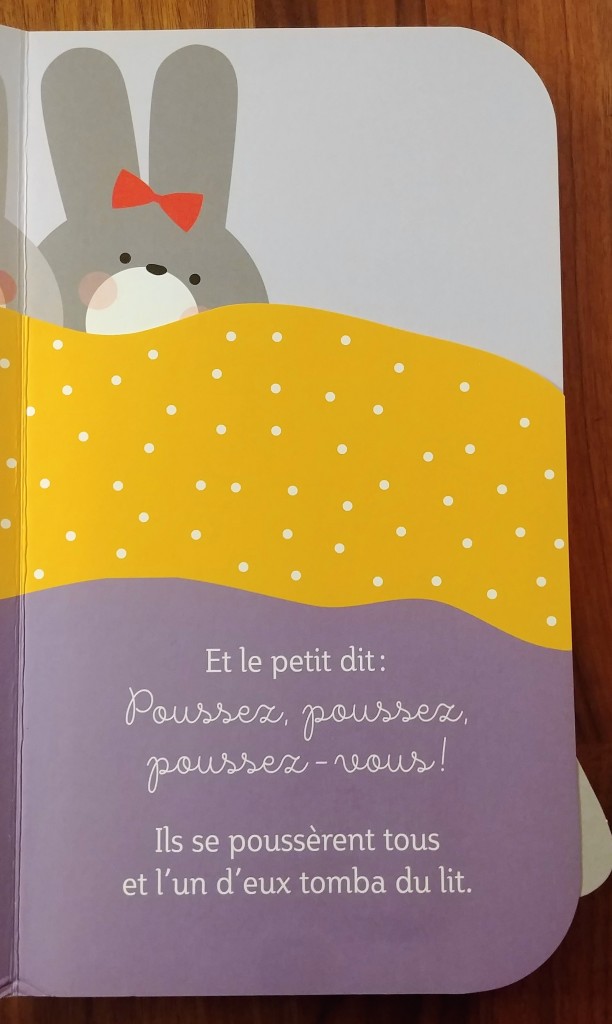 Mais je peux vous dire de quoi il est question. Un petit (ici c'est un lapin) n’est pas seul dans son lit et il voudrait bien avoir plus de place. De fait, il pousse ses compagnons qui, un par un, tombent du lit. Donc, de cinq dans le lit, ils passent à quatre, puis à trois, puis à deux et enfin le petit se retrouve seul sous les draps. Youpi ! Vraiment?
