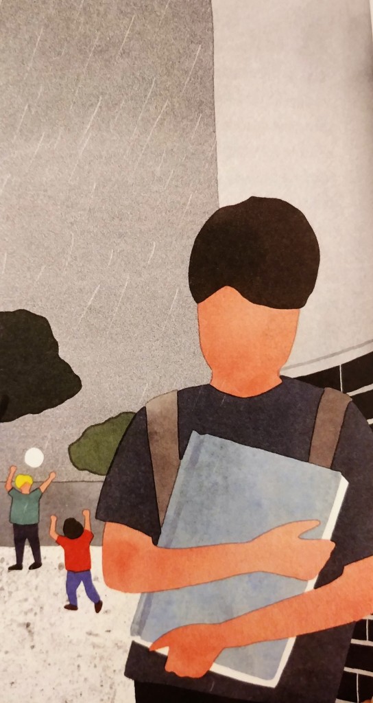 Ce sujet sensible est graphiquement soutenu par le beau travail réalisé par Julie Guillem dont les illustrations sont assez étonnantes. Les visages des personnages n’ont pas d’expression puisqu’ils n’ont pas de bouches, d’yeux, de nez… Un vide. Et pourtant… L’émotion est là, très forte, à travers ces silhouettes parlantes mais un peu déstabilisantes. Les postures et les couleurs nous font ressentir beaucoup de choses.