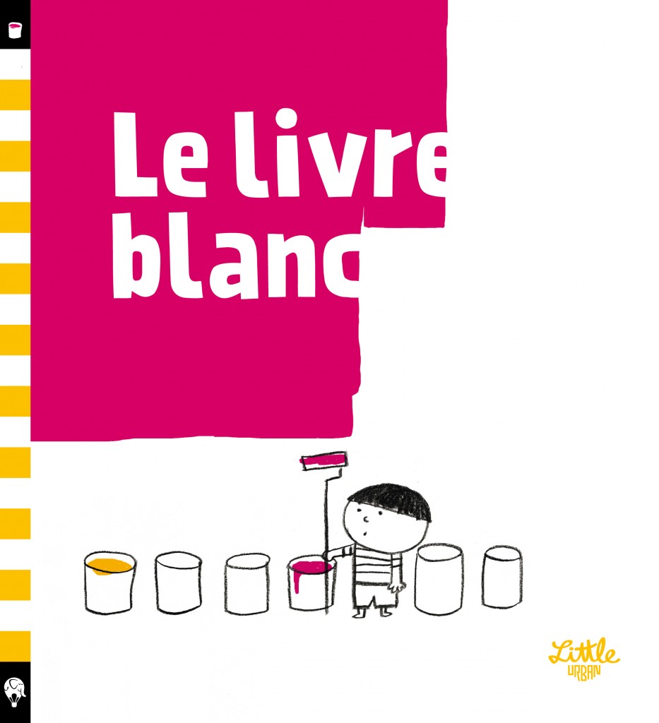 Le Livre blanc, contrairement à ce que pourrait indiquer son titre, est un album sur les couleurs. Un petit garçon, armé d’un rouleau laisse libre cours à son imagination et peint un mur blanc. En rose, il peint des oiseaux. Mais ceux-ci s’envolent. En bleu, il peint des poissons… et ceux-ci lui échappent également. Puis c’est un dinosaure vert qui l’attaque, un éléphant gris qui l’écrase, une girafe jaune qui le fait décoller du sol, un tapir violet qui lui vole son rouleau… jusqu’à ce qu’il fasse apparaître un chien orange dont il va se faire un ami. Une histoire sans texte, toute simple, au graphisme minimaliste mais terriblement efficace.